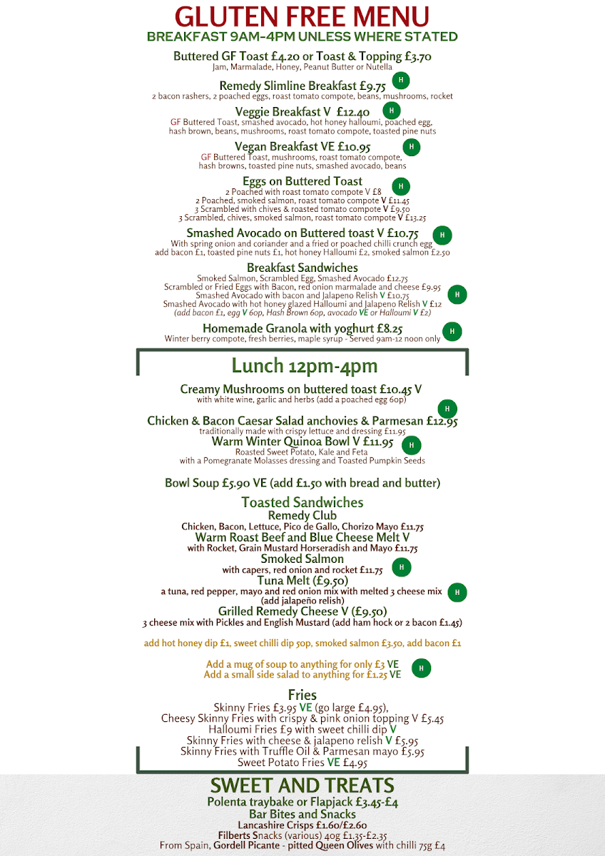 Breakfast items are served daily until afternoon, featuring hearty classics like the Remedy Full English Breakfast alongside lighter options such as eggs with avocado or scrambled eggs with roast tomato compote. Weekend specials add a touch of indulgence with dishes like Eggs Benedict or Royale, perfect for taking your brunch experience a little further. You’ll find a range of freshly toasted breads, topped with everything from nutella to honey, catering to both quick bites and more substantial breakfasts.